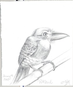 I am drawing most of these birds off of the “Wildlife Fact Files” my dad got for me as a child, (Thanks, Dad) so I am learning little random factoids about the birds as I draw. Fun fact about this bird: the Germans call them “lazy birds” because they sit completely motionless for long periods of time waiting for prey such as insects.