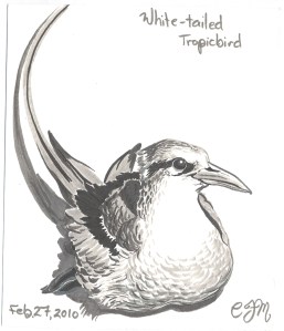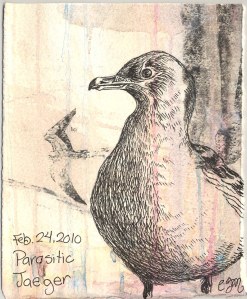 The photo for this drawing came from the “Wildlife Fact File.” I am tickled by the description of this bird as “a bold pirate that harasses other birds in breathtaking aerial chases.” He gets his name because he steals almost all of his food. He forces other birds to drop their prey, which he then catches midair. He doesn’t do any of his own hunting. yar.
