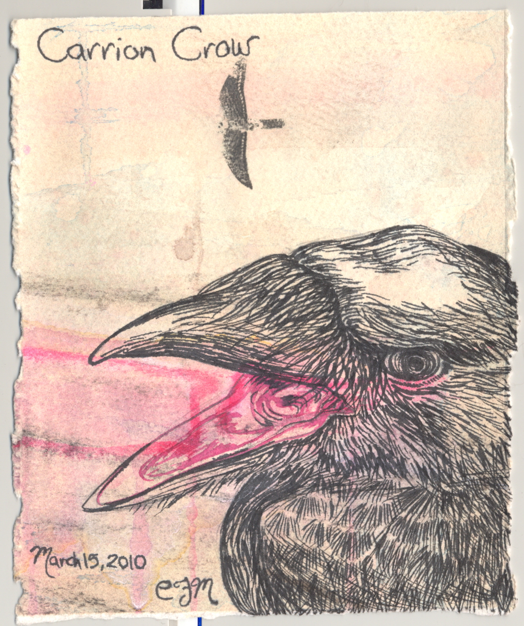 I’m proud of how this one came out. I think the pen & ink was a wise choice of medium. The scratchy quality of the pen nib really added texture. I also lined-up the wide-open mouth of the crow with a red patch on this re-purposed paper. So it worked out that I didn’t need to add coloring to his mouth. Nice.