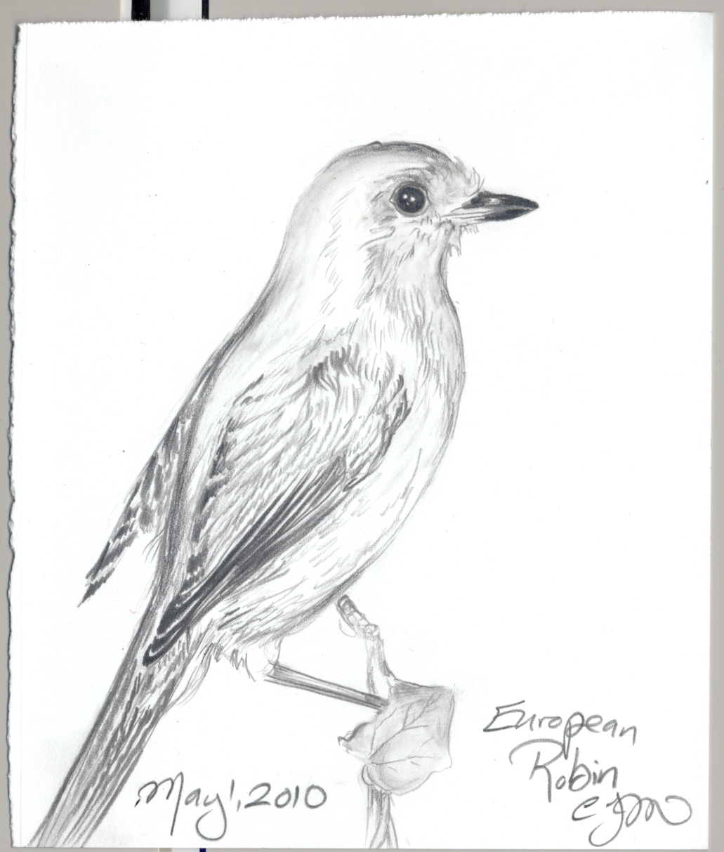 European Robin March 26, 2013 | clairemeyler Robin drawn without his redbreast. A study in wing feathers with graphite rather than color. Share this: Click to share on X (Opens in new window) X Click to share on Facebook (Opens in new window) Facebook Like Loading... Related