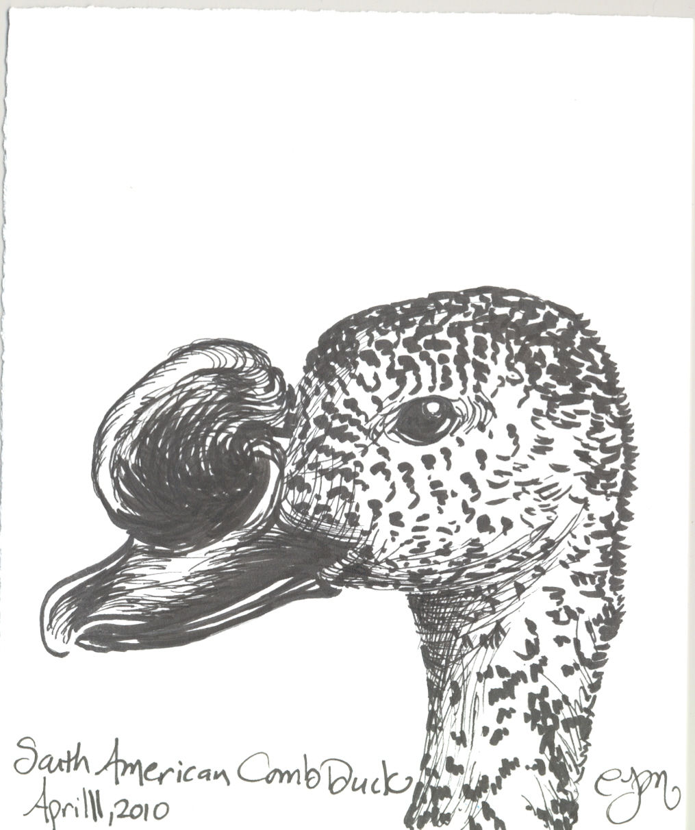 Duck April 6, 2013 | clairemeyler This was a National Geographic find. I love this little guy, curiously sticking his bill into the camera. It was a fun perspective to draw.